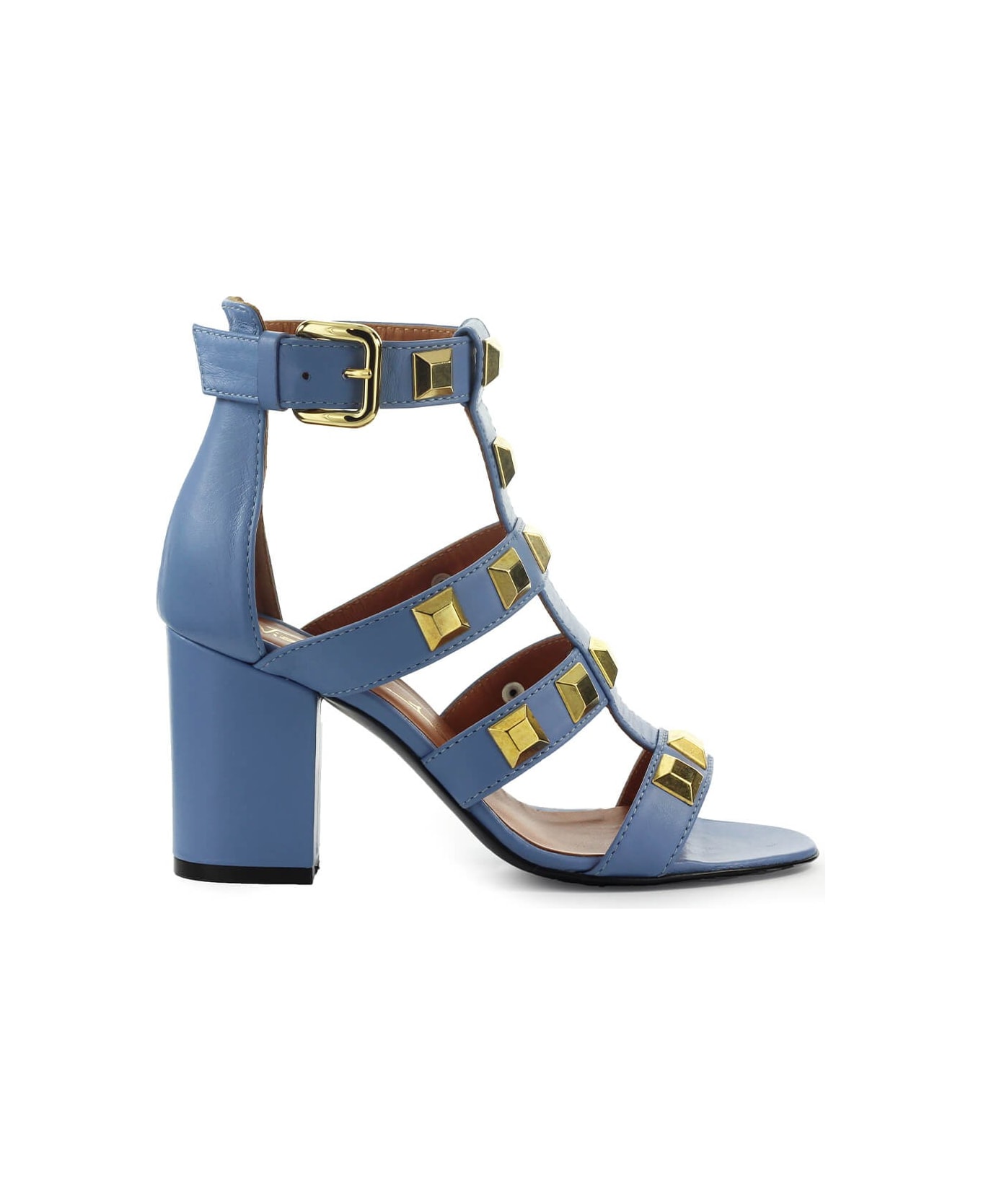 Via Roma 15 heeled sandal made of light blue leather. Lists decorated with maxi golden metal studs, ankle strap closure. Leather sole, heel height 8 cm.