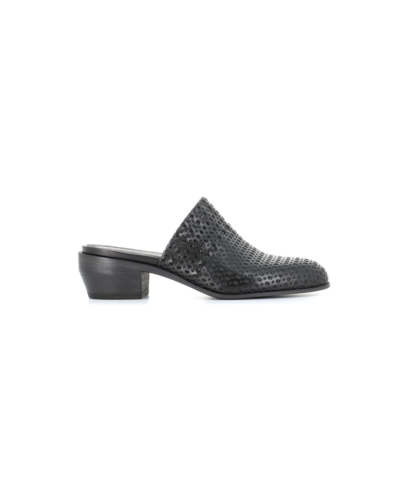 Black leathet Sabot from Pantanetti, featuring by a perforated decoration. Partially lined interior. Leather sole. Heel: 5,5 cm