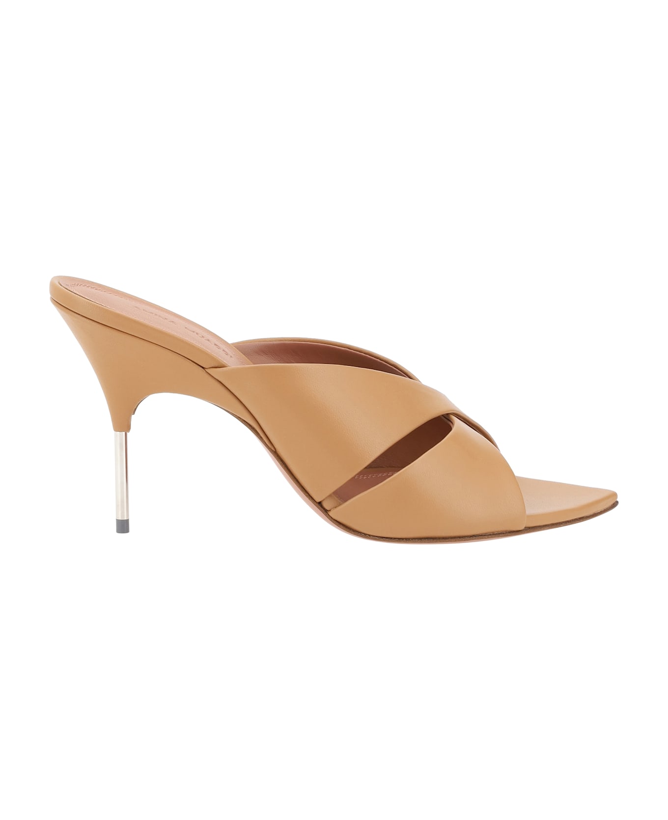 Amina muaddi's samantha sabot sandals are a combination of elegance and boldness. with an elongated toe and a metallic stiletto heel, these sandals enhance the silhouette with a sophisticated note. the crisscrossed front bands add a dynamic touch to the design, while the logo-embossed insole emphasizes the brand's luxury. perfect for a special evening or for those looking for an accessory that combines comfort and style in one unforgettable pair of shoes.