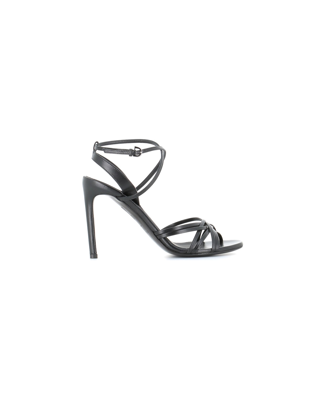 Black leather Sandal from Del Carlo, featuring by a crossed sling-bag fastening with side buckle. Leather sole. Heel: 10 cm