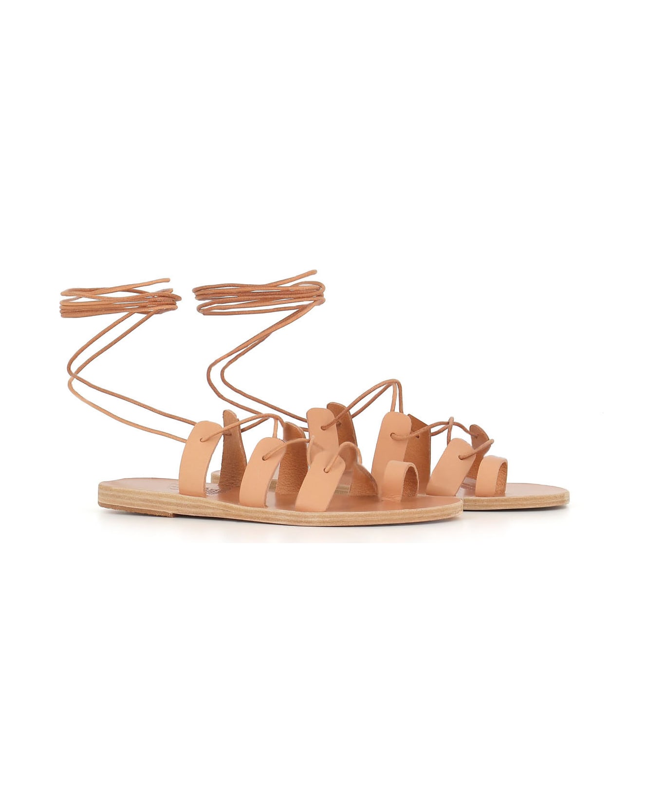 Beige natural leather Sandal from Ancinet Greek Sandals, featuring an adjustable ankle lace fastening. Leather sole. This type of leather is free of chemicals, ages over time and slightly changes its initial colour. Heel: 1 cm