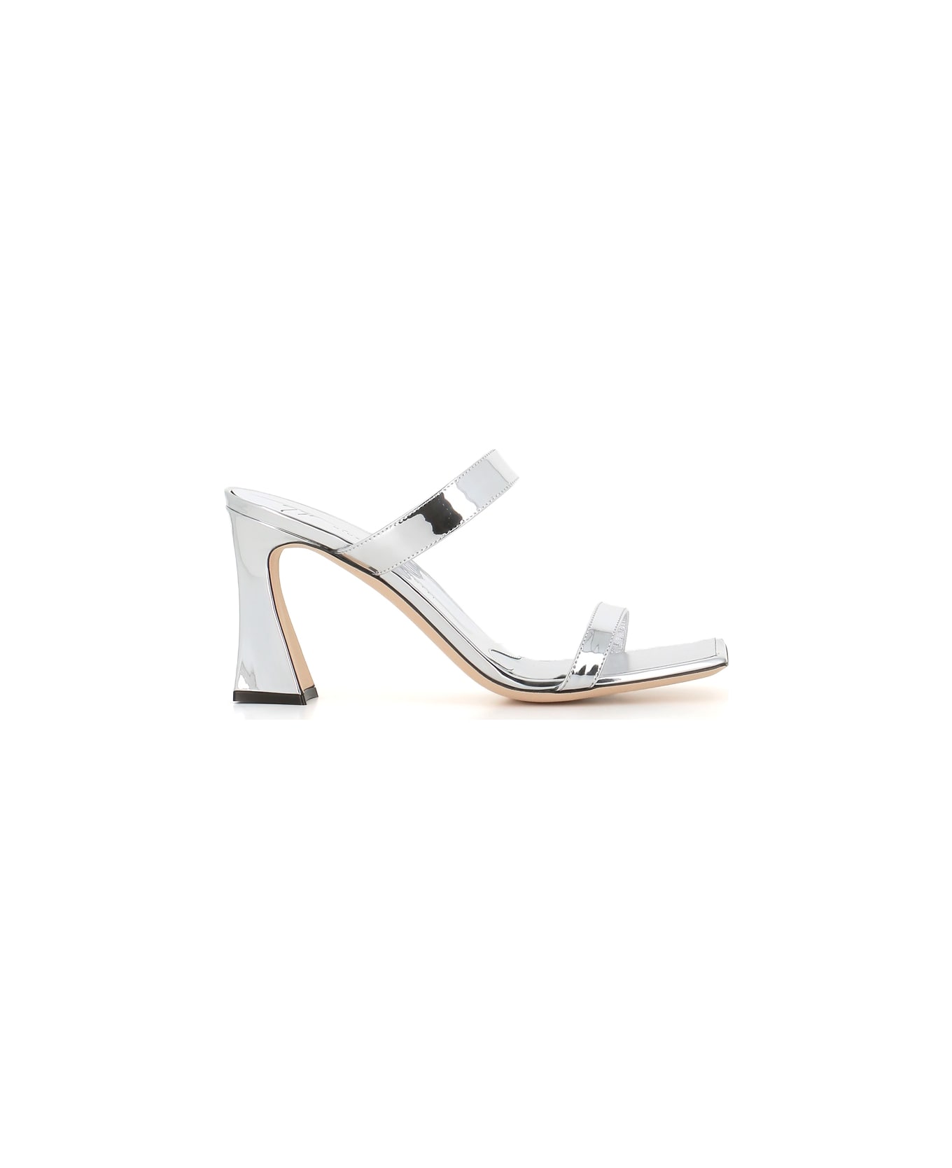 Silver patent leather Mule from Giuseppe Zanotti, featuring by a double strap and a square toe. Leather sole. Asymmetrical heel: 8,5 cm.