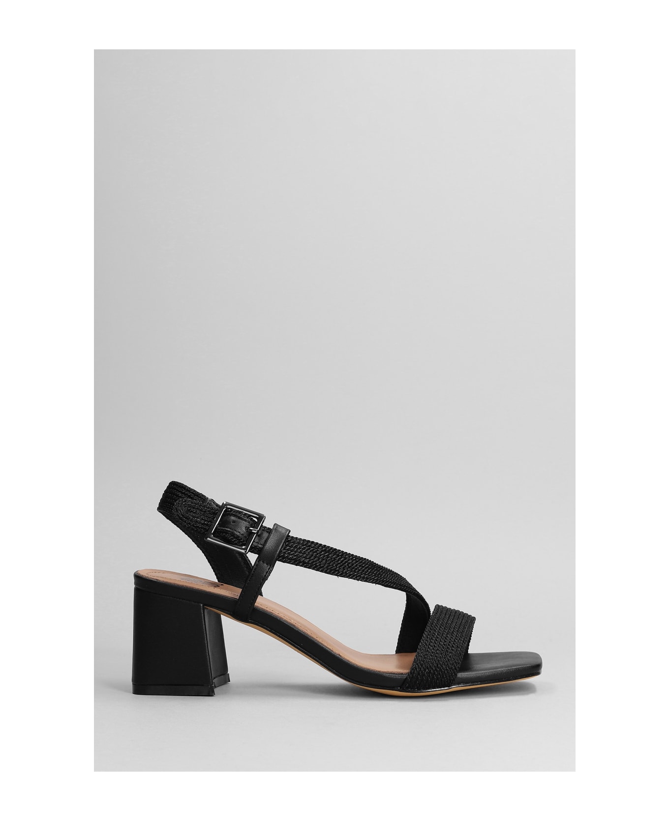 Sandals in black synthetic fibers, one strap, double ankle straps, leather detail, 70 mm heel, leather sole, Made in Spain