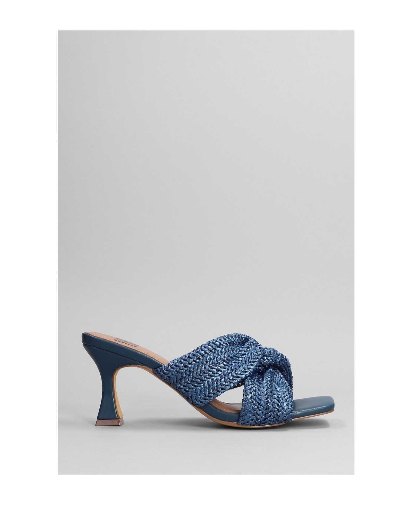 Slipper-Mule in blue synthetic fibers, square open toe, cross straps, leather sole, heel 85mm, Made in Spain