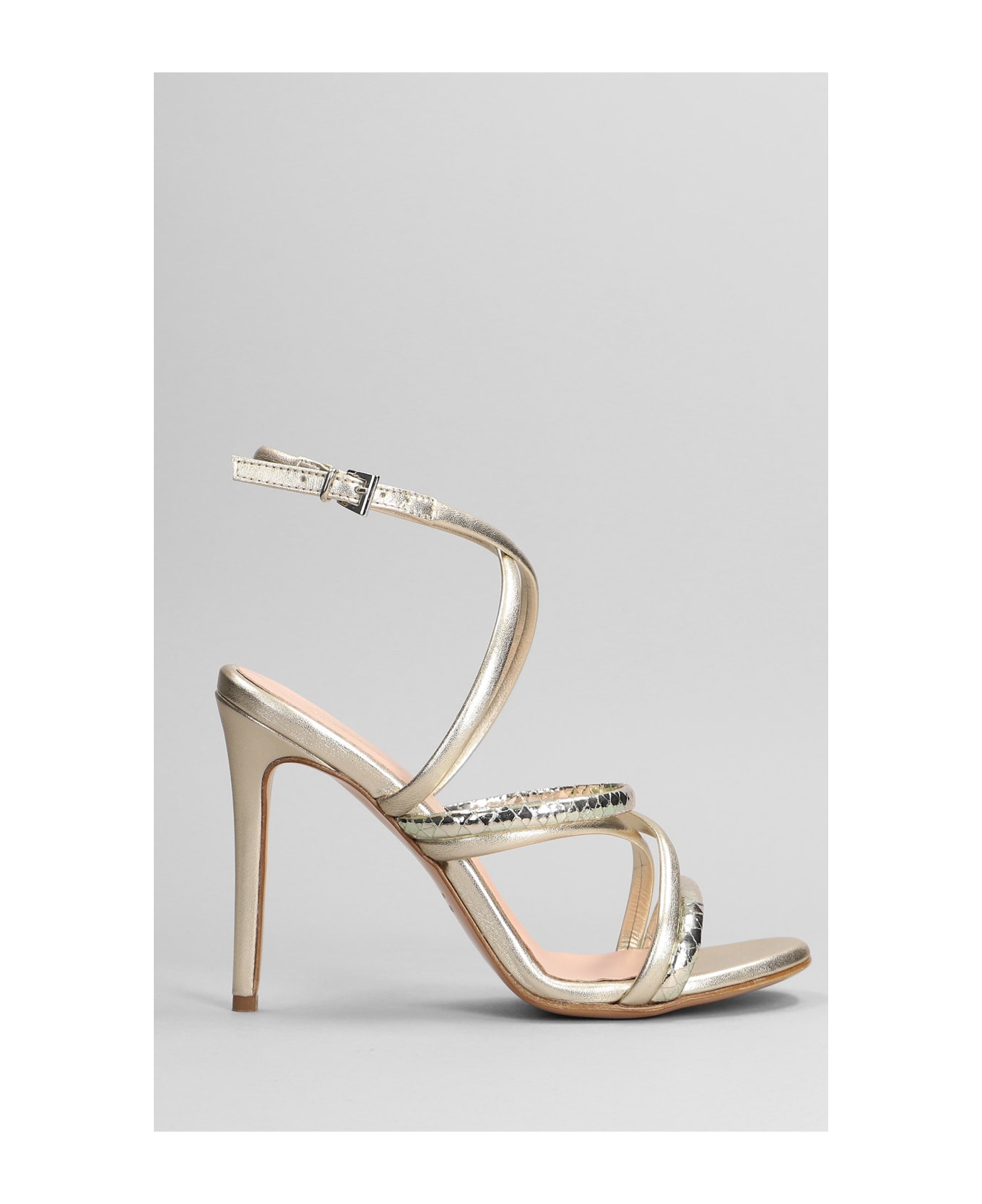 Sandals in platinum leather, cross straps, 120 mm heel, leather sole, 100% leather