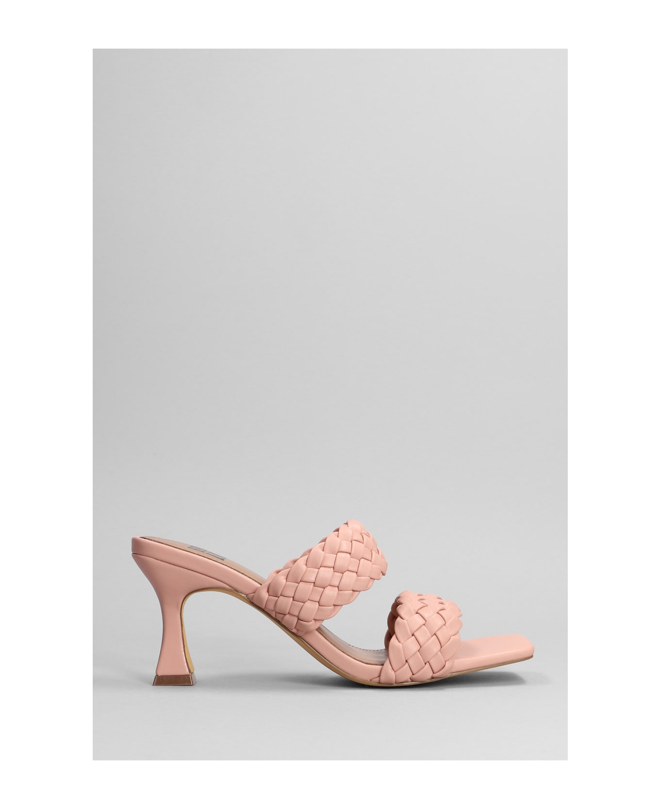 Sandals in rose-pink leather, two straps, woven design, square open toe, heel 85mm, leather sole, 100% leather, Made in Spain