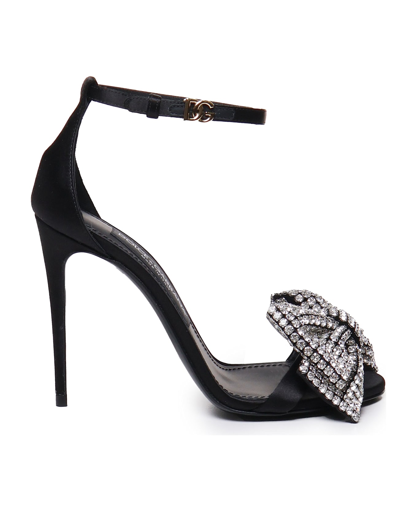 -Satin sandals -Ankle strap -Bow with rhinestones -Heel 105 mm -Made in Italy -Colour: Black