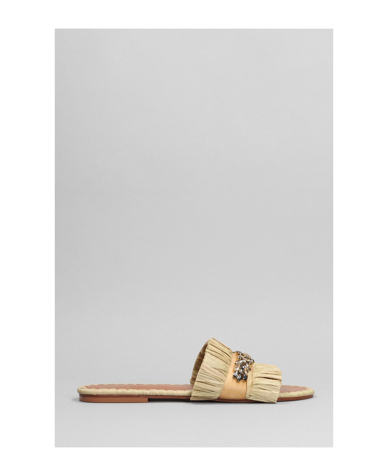 Semira Slipper-Mule in beige Silver, fringe, one strap, cristal details, Made in India, 100% rafia