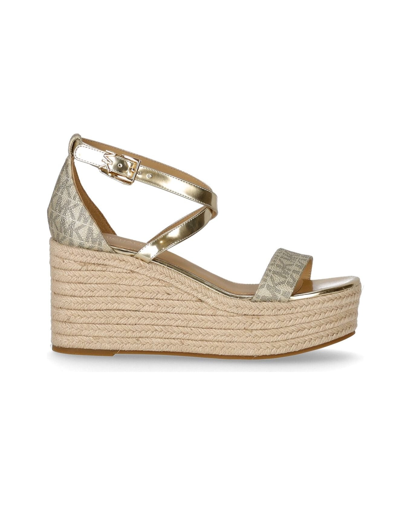 Serena sandal by Michael Kors made of faux leather and coated canvas with monogram motif in gold tones. Ankle strap closure, leather insole and 8 cm wedge with rubber sole. Composition: 89. 4% coated canvas, 9. 6% polyester, 1% polyurethane.