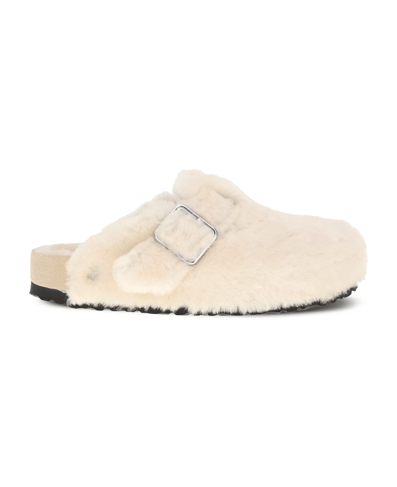 The boston shearling mules with narrow fit by birkenstock 1774 offer the perfect blend of comfort and refined style. made with a soft fur lining and a warm lamb fur footbed, they are designed to wrap the foot in a hug of softness. the anatomical cork and latex footbed provides ideal support, while the eva sole ensures lightness and flexibility. adjustable metal buckles complete the design for a customized fit and timeless aesthetic.