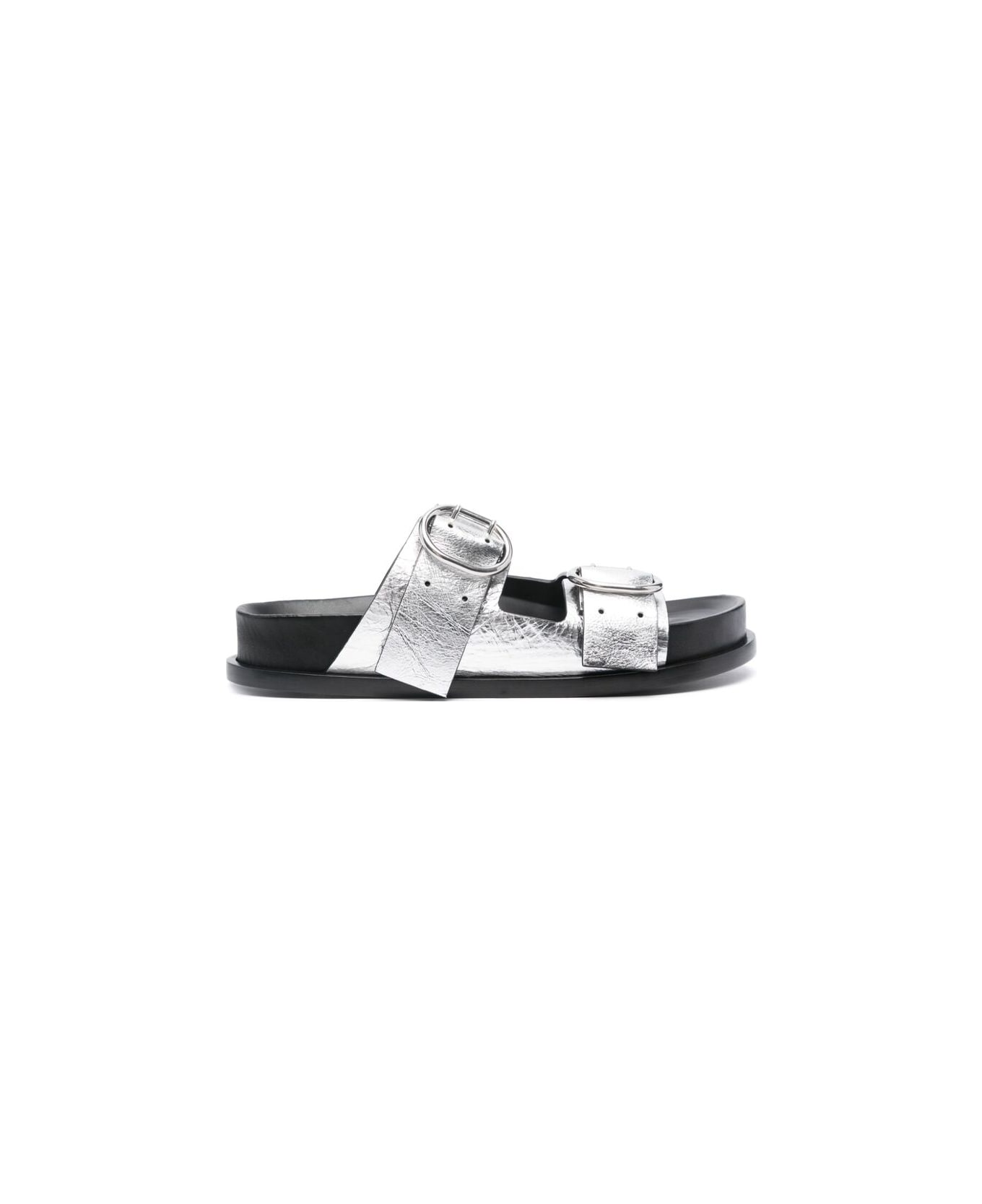 silver-tone black calf leather cracked effect open toe branded leather insole moulded footbed contrasting flat leather sole silver-tone hardware two buckle-strap fastenings This piece comes complete with a protective dust bag.