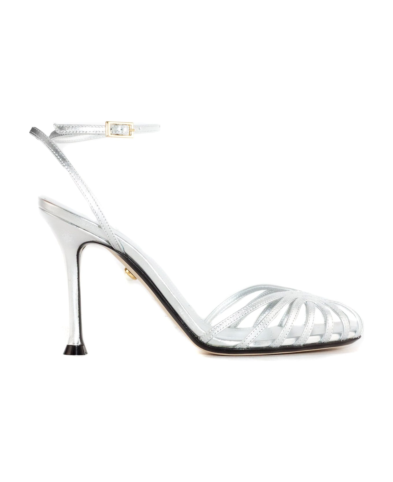 Silver leather cage sandals with heel in tone, thin strips at the toe and crossed ankle strap with small side buckle, heel 9,5 cm Composition: Leather, 100%