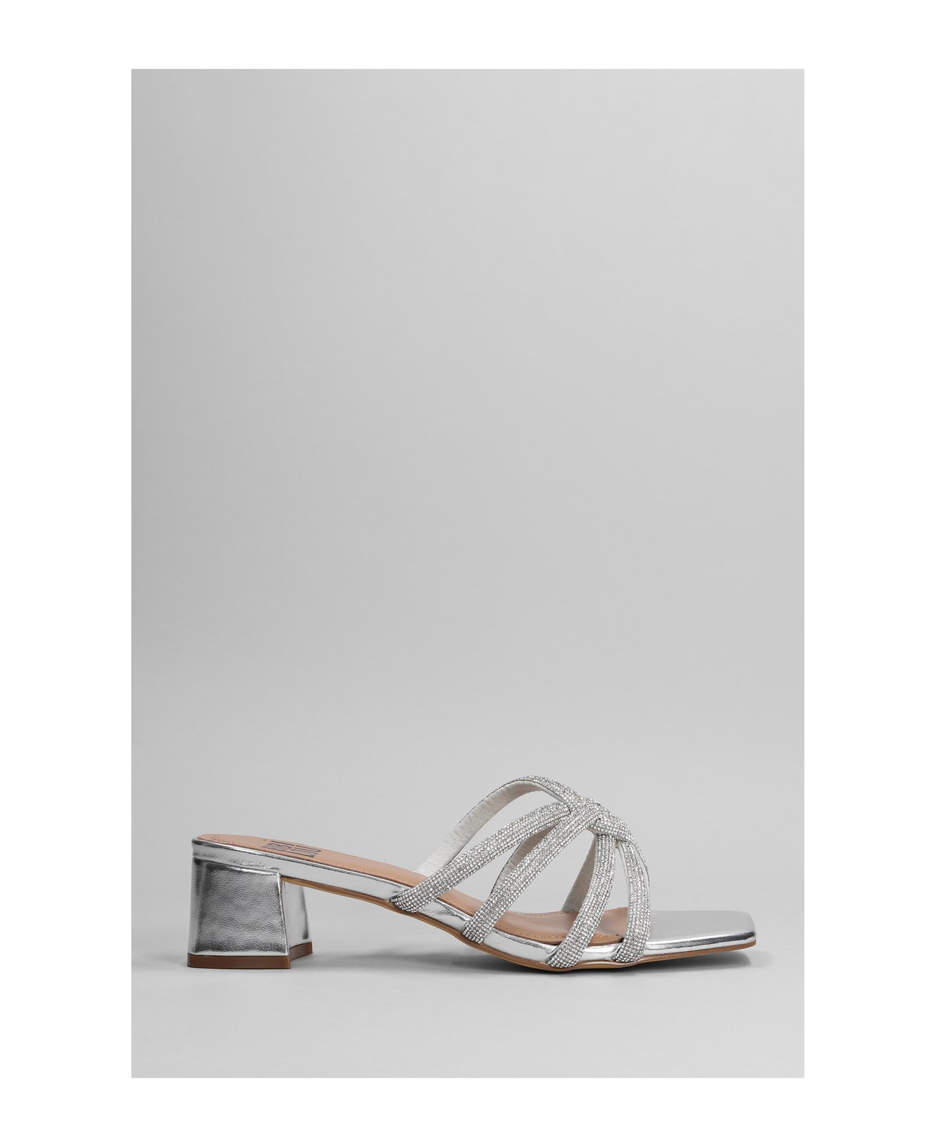 Slipper-Mule in silver leather, multiple thin straps, square open toe, heel 55mm, strass detail, 100% leather, Made in Spain