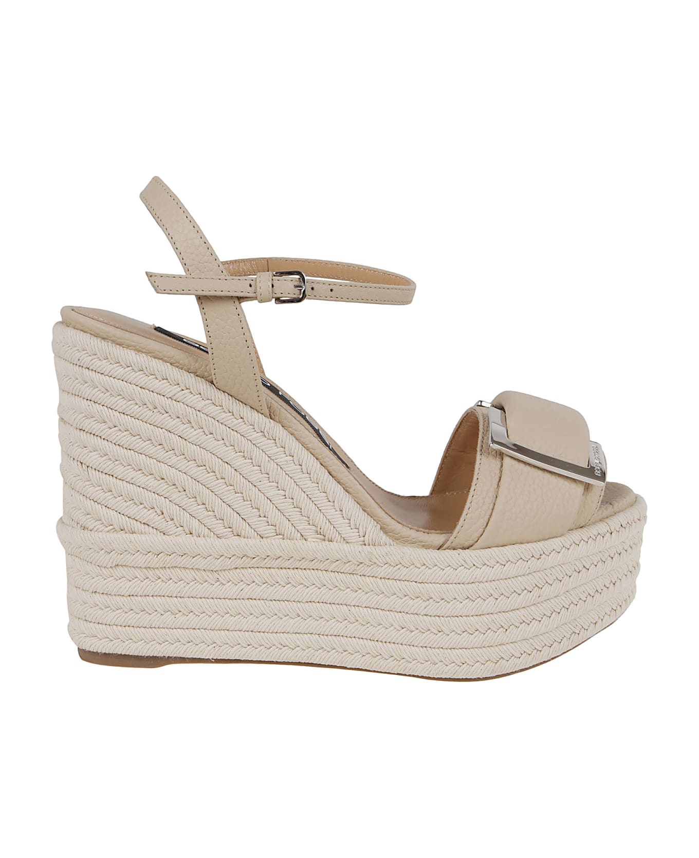 Sr Prince wedge sandal in leather BY SERGIO ROSSI. Closure with delicate strap that wraps around the ankle; upper band embellished with maxi logoed buckle in silver metal.