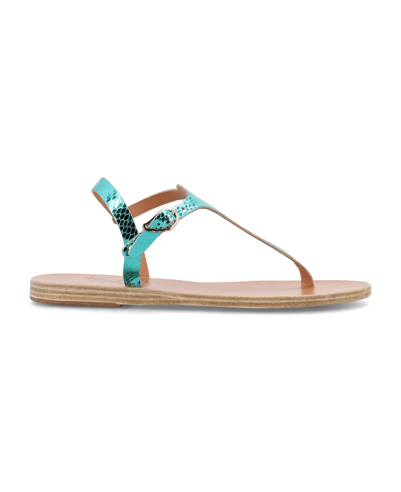 Leather Themis Low Metallic Fishscale Sandals By Ancient Greek Sandals. Featuring: Thong Style Round Toe Flat Leather Sole Slingback Strap Adjustable Buckle