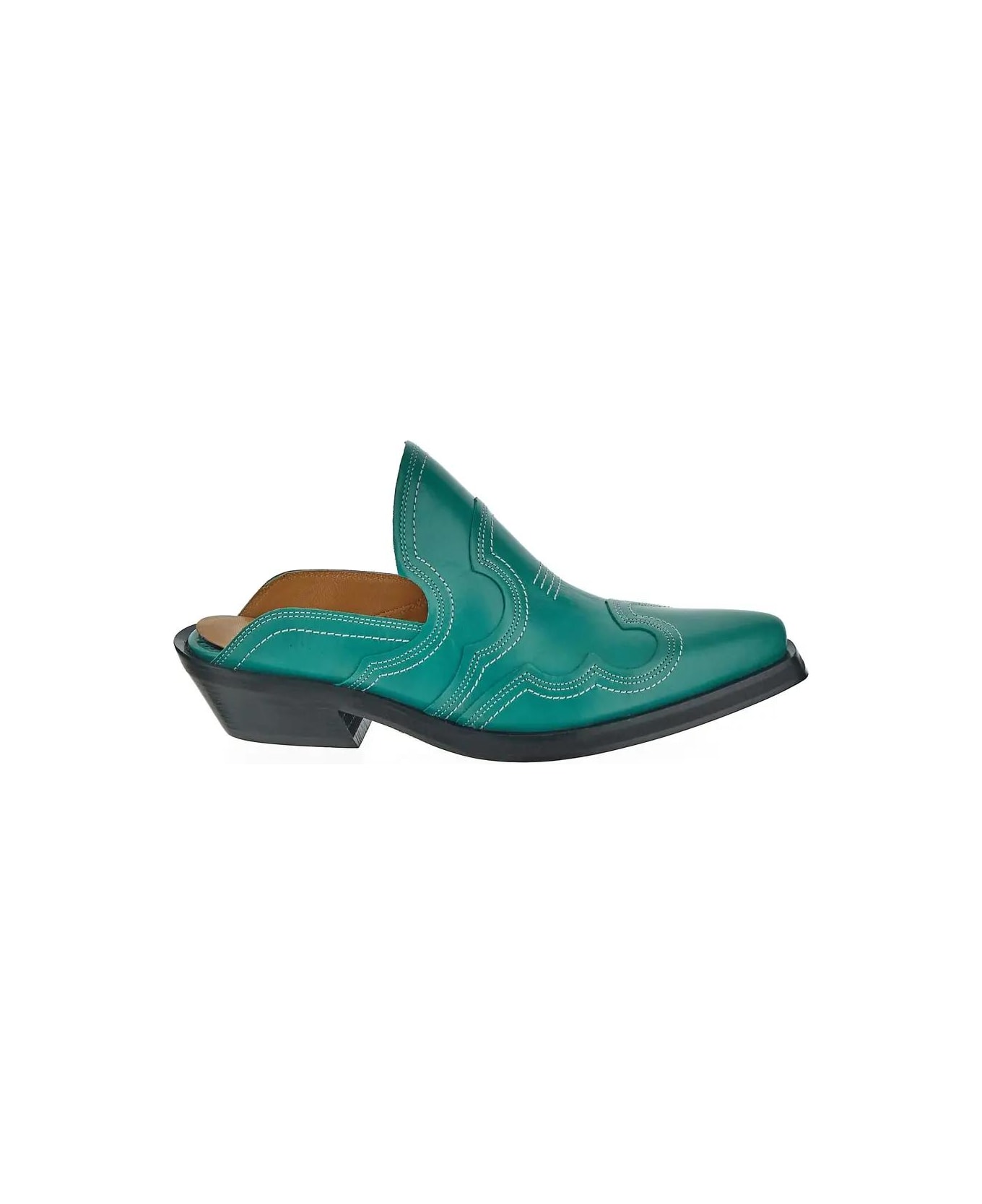 Ganni mules in bottle green leather with Western contrasting topstitched design, pointed toe slightly square at the bottom, slanted block heel in black tone, superimposed cutout panels on the vamp and debossed logo on the insole. Composition: 100% Leather