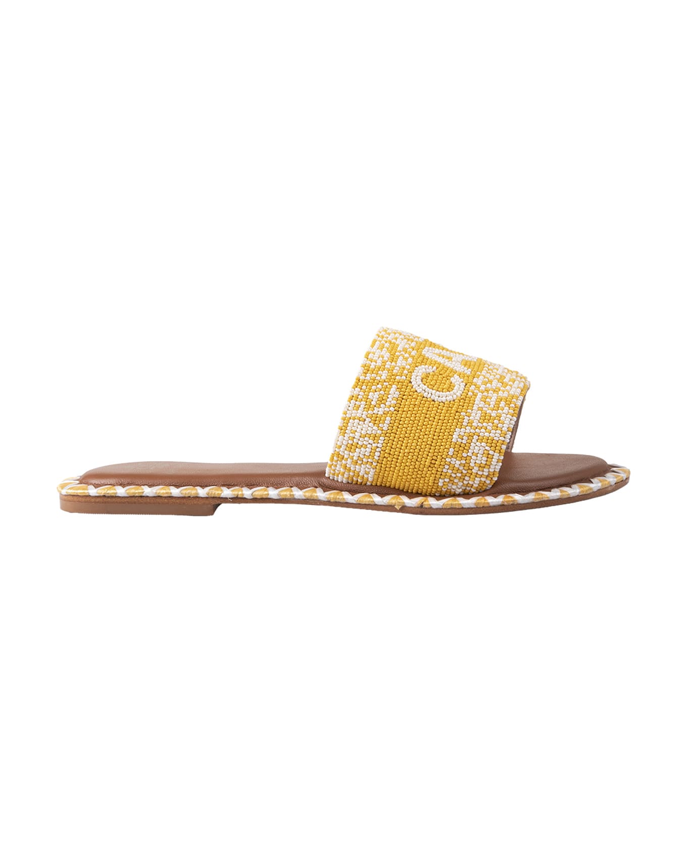 Yellow-coloured Capri low sandal by De Siena crafted by hand with dozens of small beads and an eye-catching embroidered sole. It features leather lining, a leather sole and an open round toe.
