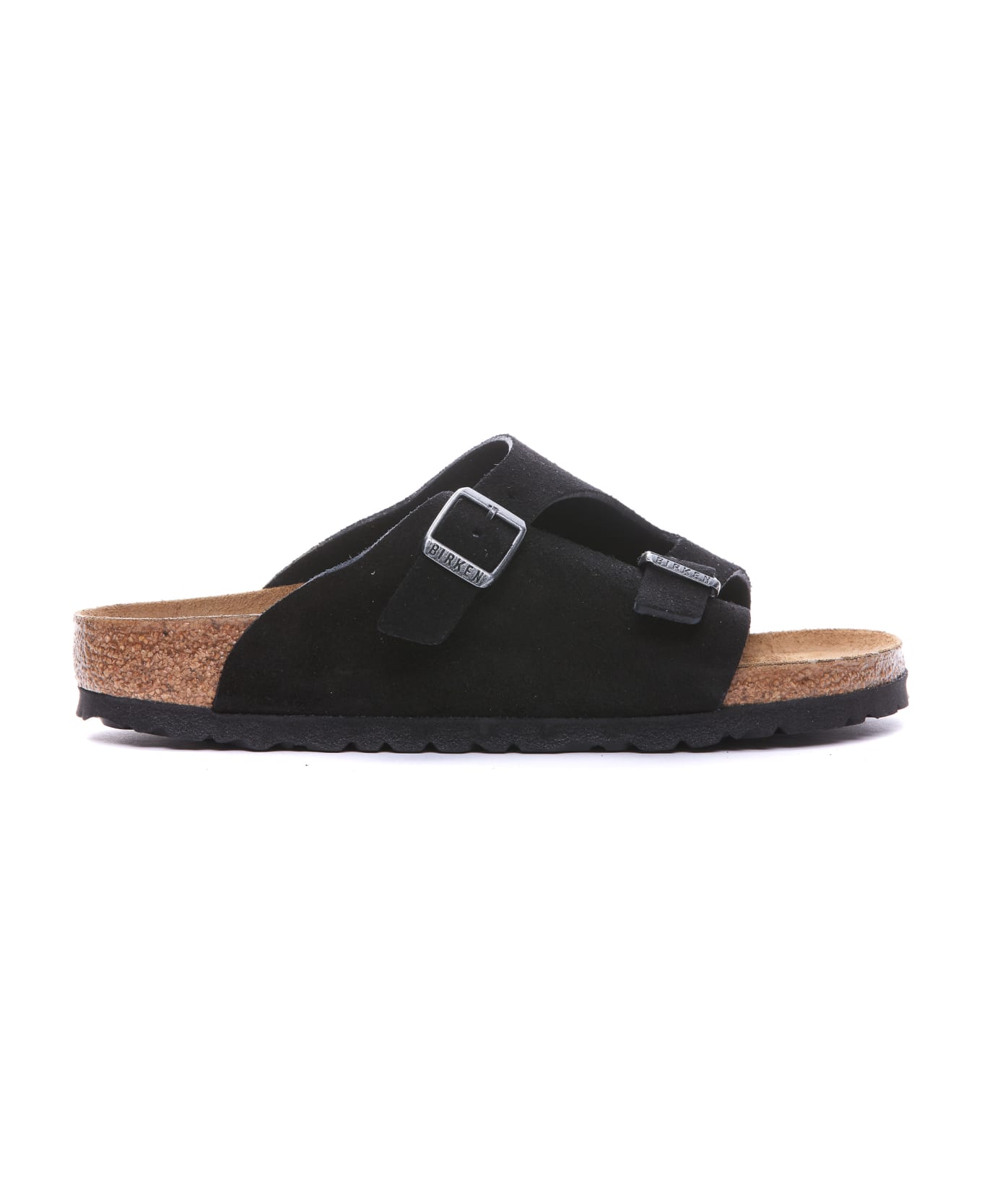 Birkenstock black Zurich sandals, suede upper, round open toe, lateral buckle closure