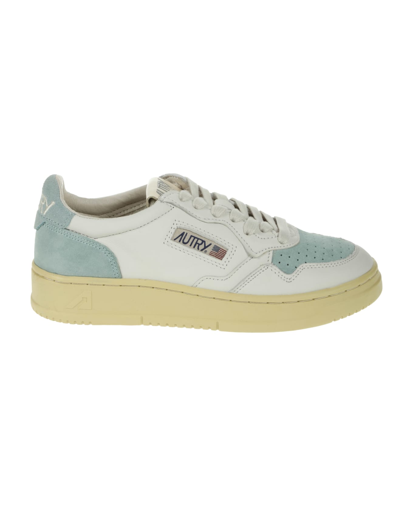 Autry White leather sneaker, turquoise suede inserts, rubber sole, logo detail. Composition: 70% + Cow Leather, 20% + Canvas, 10%