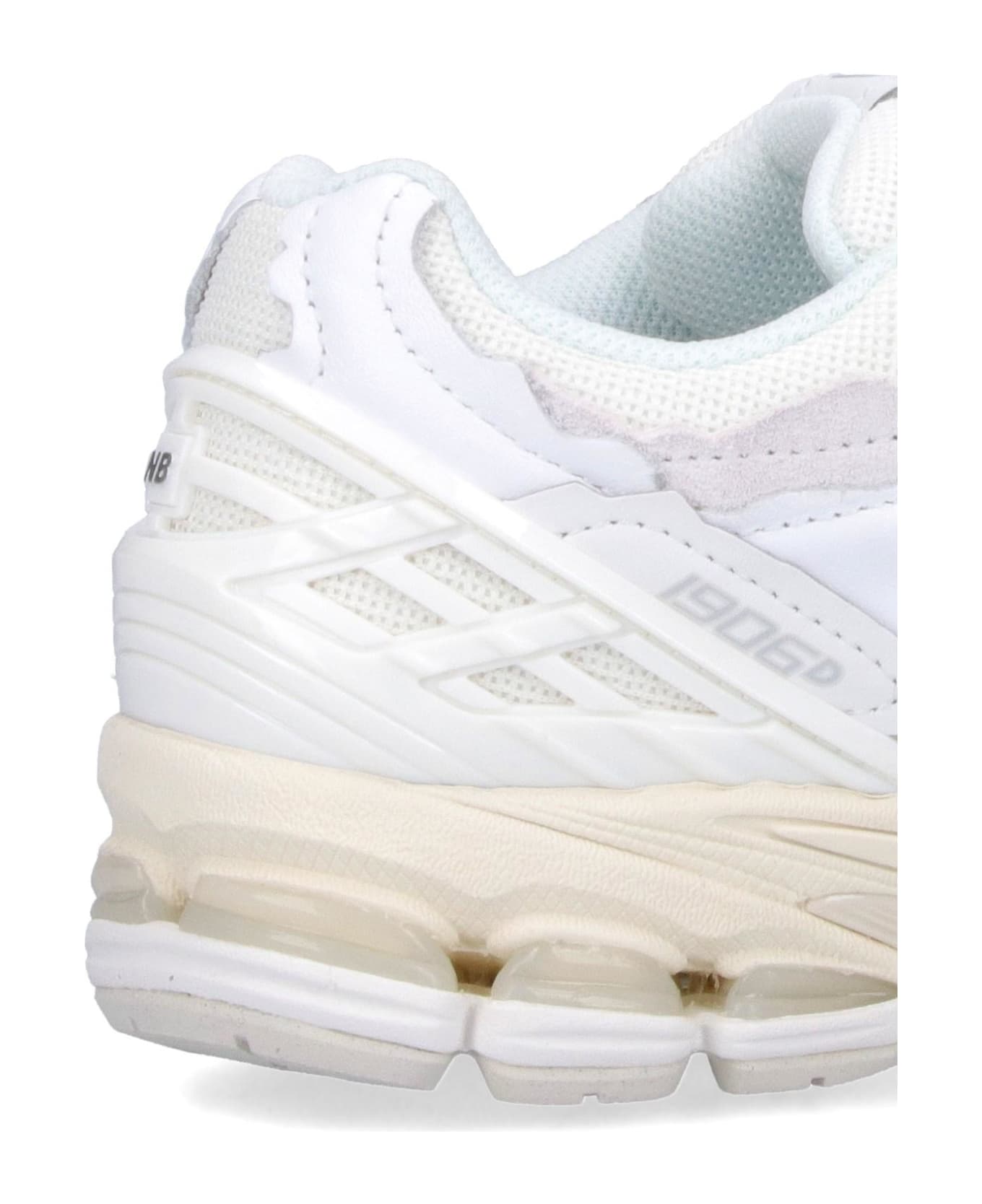 New Balance '1906R' sneakers in white suede with mesh details, round toe, laces, logo label on the tongue, destroyed details, tone-on-tone patch detail on the side, cream rubber sole.