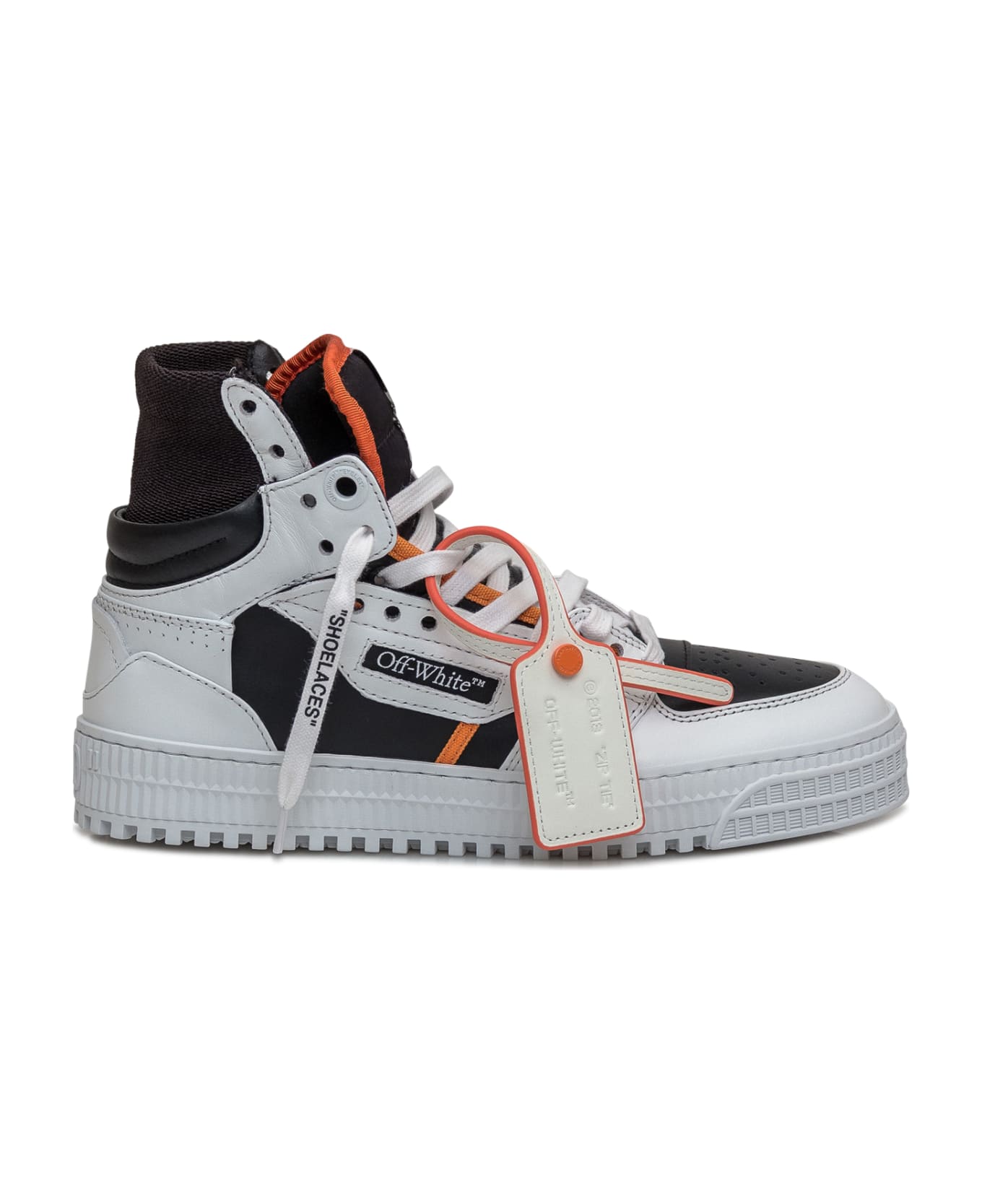 Black leather sneaker. Perforated toe. Closure with maxi laces. Arrow logo in relief on the side. OFF-WHITE logo on the side. Lettering 3. 0 in relief on the heel.