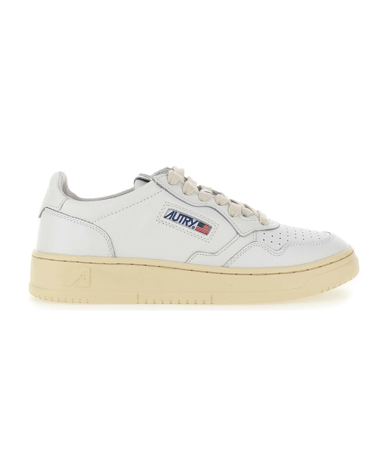 Autry "Aulw LL15" women's sneakers white leather, inspired by vintage models of Eighties, upper with stitching that defines the multilayer inserts in tone, perforated toe to facilitate perspiration, fastening with laces, leather tongue with foam padding and tone-on-tone stitched label, padded collar, iconic tone-on-tone back patch with embossed logo, 4cm high logoed rubber sole.