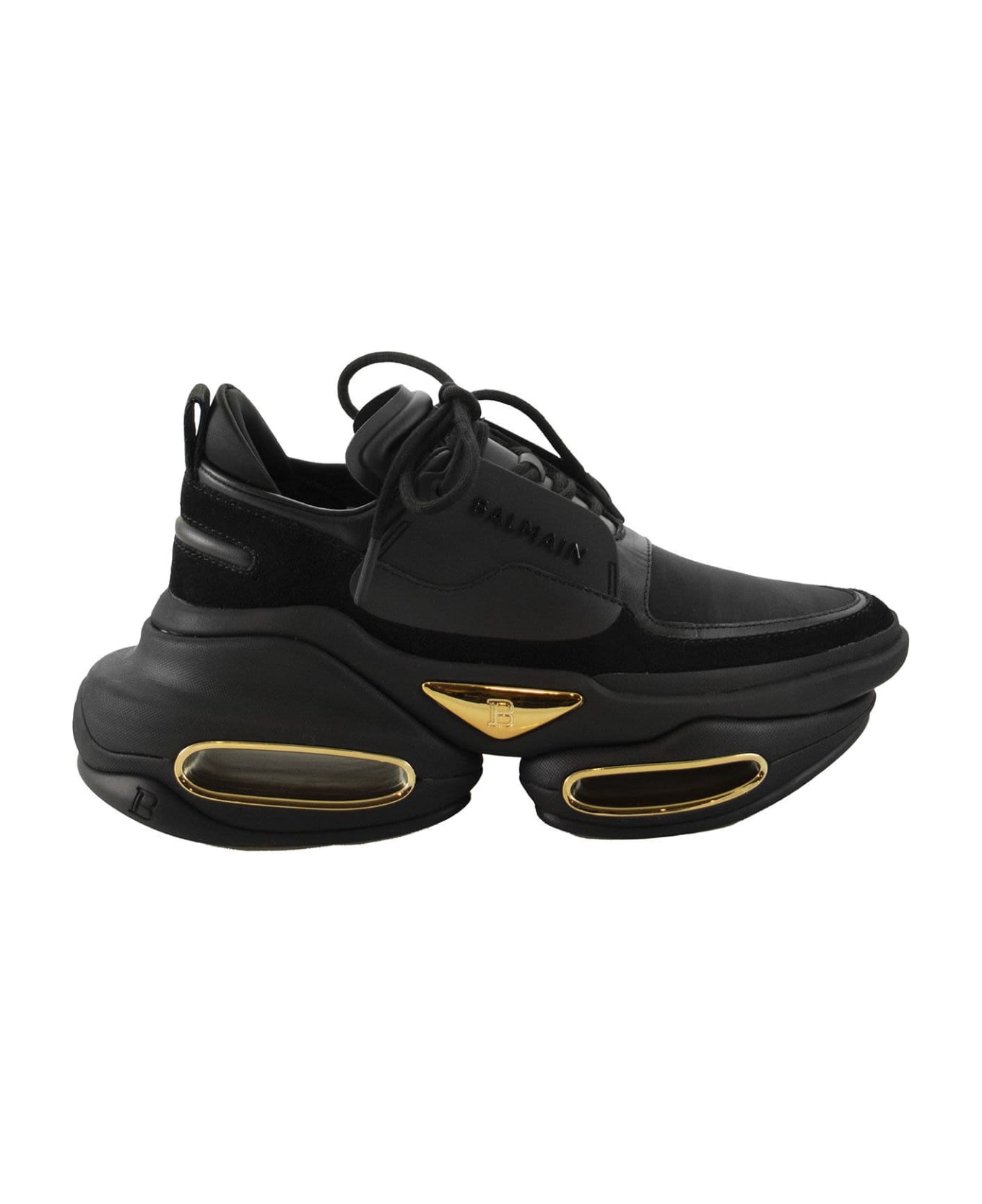 Black BBold low sneakers in calfskin Black laces on the top, thick black soles, open areas finished in gold metal on the sole, embossed gold panel with Balmain logo.