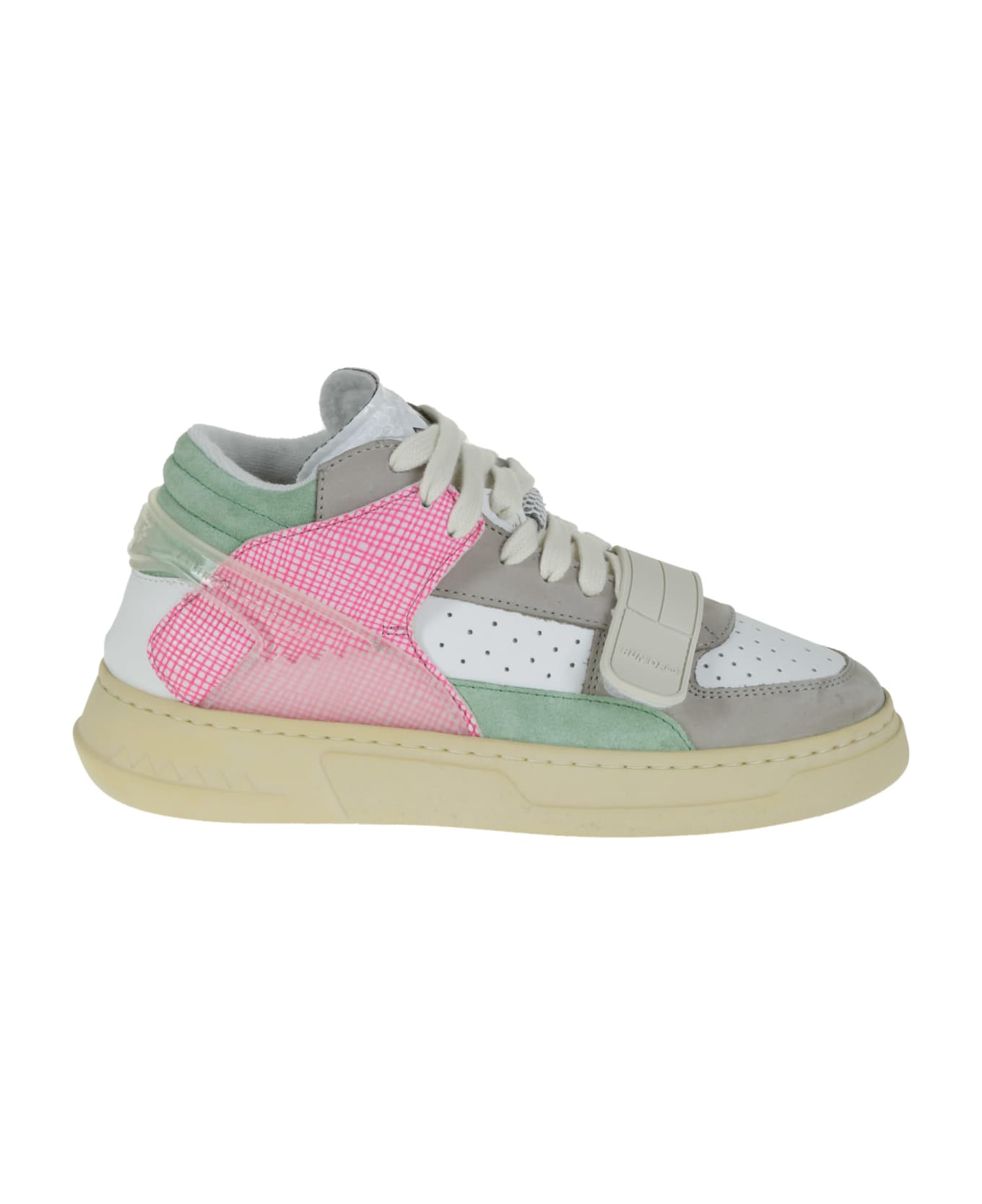 Run Of sneakers in leather with pink, green and gray inserts, band with velcro on the front, perforated toe, transparent band with logo on the back. Composition: 100% Leather