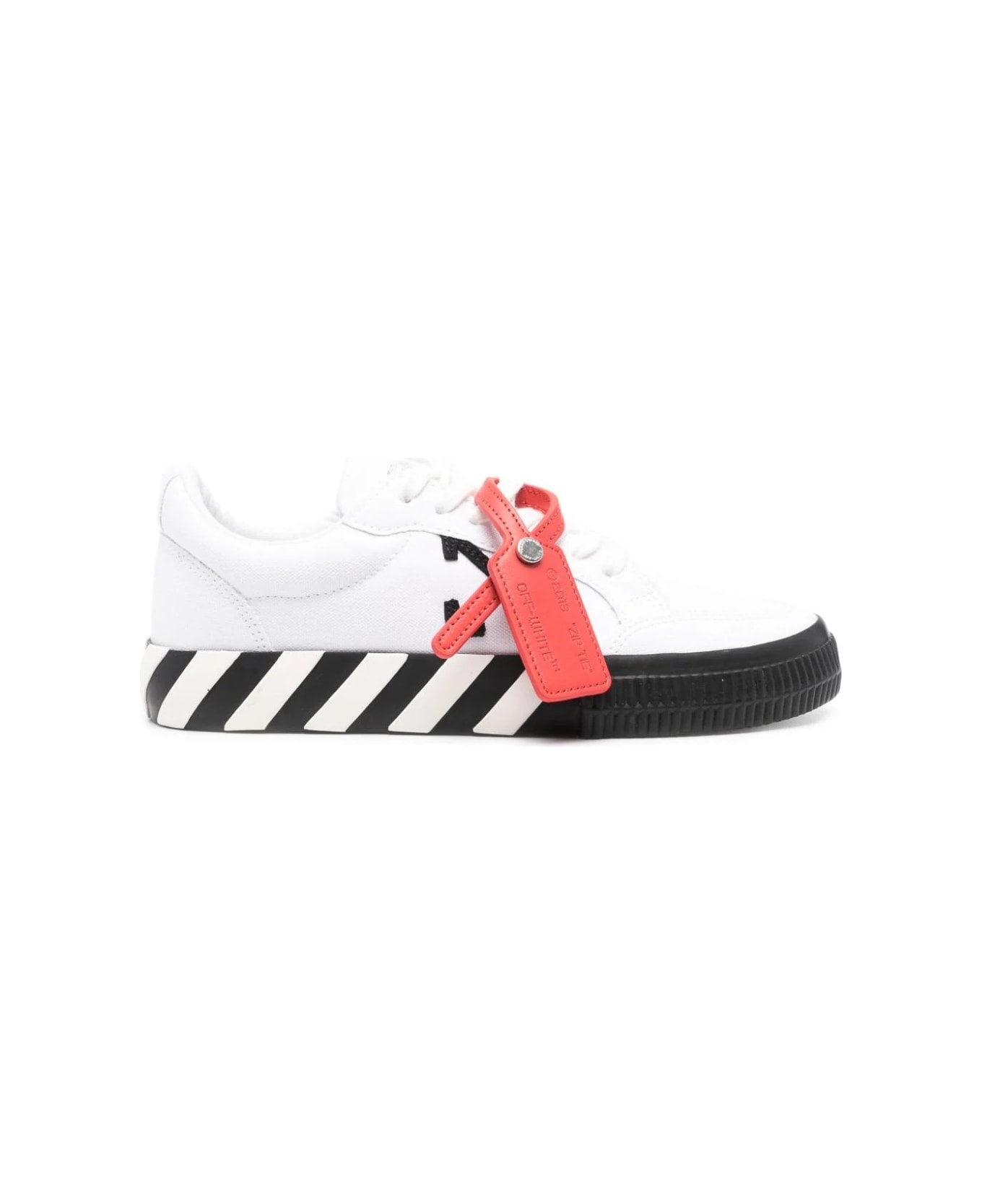 White Vulcanized low sneakers for women by Off-White made of leather and fabric and featuring a round toe, red tag, lace-up design, iconic black side arrows and a black rubber sole with white stripe pattern.