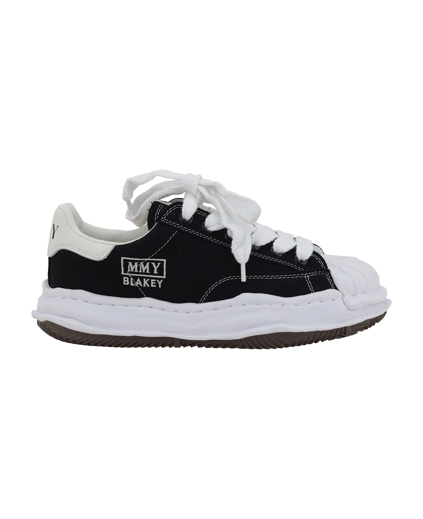 Maison mihara's blakey sneakers are a perfect blend of urban style and distinctive details. the black canvas upper, paired with white rubber, creates a stylish contrast. the lace-up closure and logo patch tongue add a touch of personality, while the side logo embroidery and white leather heel with logo print highlight the brand. contrast stitching and a rubber sole complete the design, making these sneakers a versatile and trendy accessory.