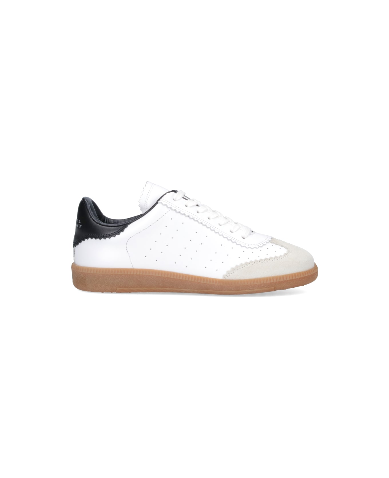 Isabel Marant 'Bryce' Sneakers, white leather, beige suede detail, round toe, lace-up closure, perforated upper, black back tab silver logo print detail, brown rubber sole.