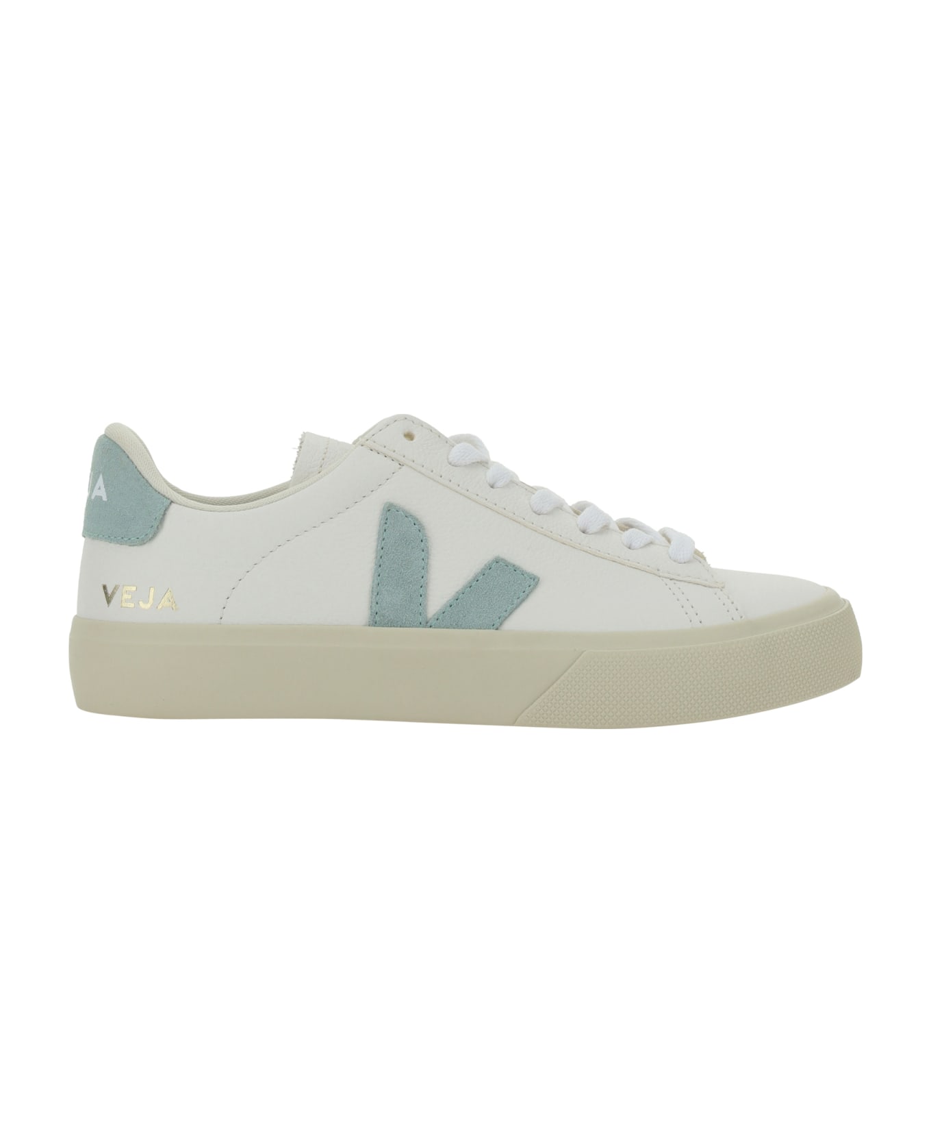 Calfskin campo chrome sneakers by veja, round toe, contrasting panel detailing, contrasting iconic brand logo appliqué on side panels, lace-up front fastening, embossed logo tab, logo appliqué on tongue, contrasting heel reinforcement.