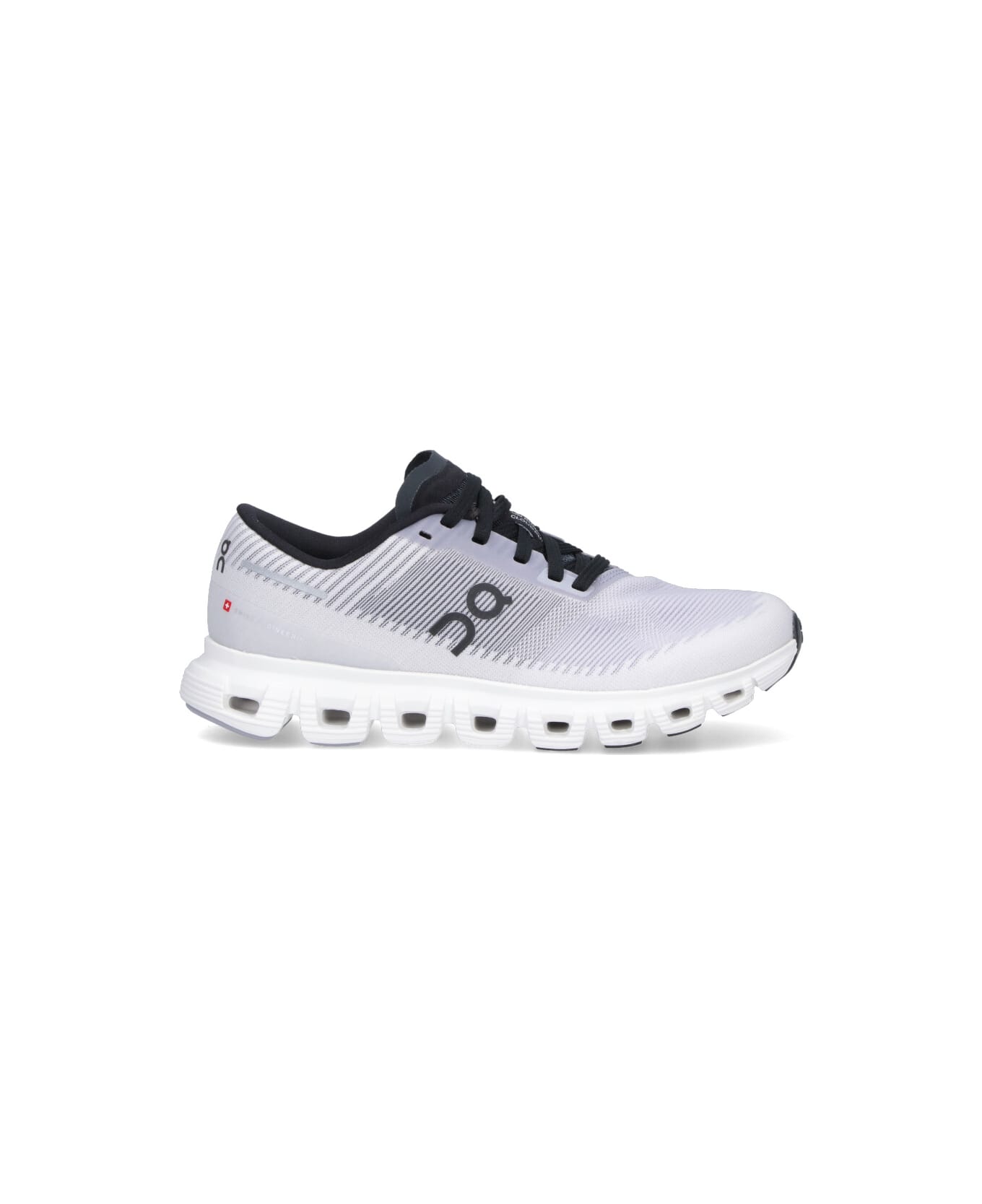 On 'Cloud 6' sneakers in white and purple mesh with round toe, black laces, logo label on tongue, side logo print, logo print on the back tab, red 'Swiss Engineering' label on the back, textured rubber sole.