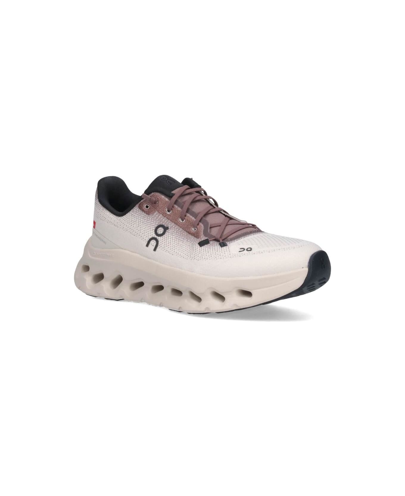 On 'Cloudtilt' sneakers in beige fabric with top taupe details, round toe, black logo embroidery detail, lace-up closure, logo embroidery on the tongue, side and back logo embroidery, mini 'Swiss Engineering' label on the back, textured rubber sole, embossed logo detail on the side.