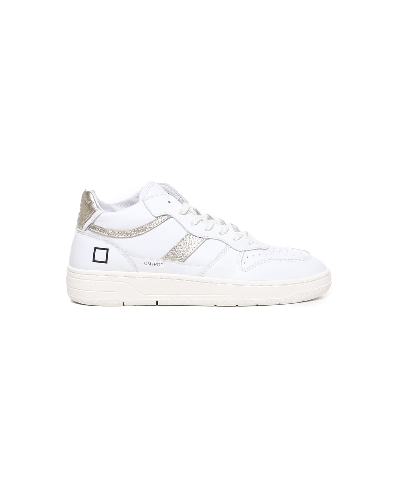 White-platinum Court 2.0 Mid Sneakers from D.A.T.E. -Leather tongue with logo -Cotton laces -Laminated leather side band -Laminated leather heel tab -Rubber sole -Regular fit -Color: White, Platinum -100% Leather