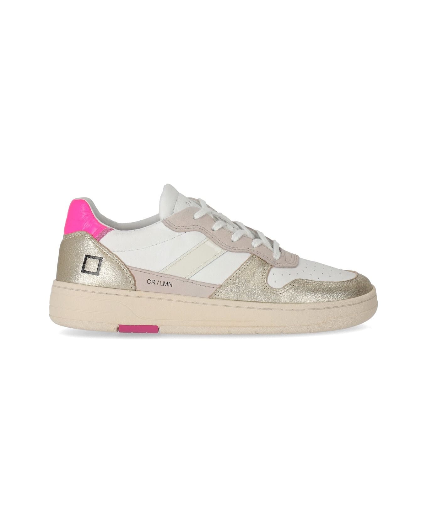 Court 2. 0 Laminted sneaker by D. A. T. E. made of white leather with platinum-colored laminated inserts. Contrasting nubuck and patent leather details, fluo fuchsia heel. Leather and cotton terry lining, perforated toe and white cotton laces. Rubber sole, height 3 cm.