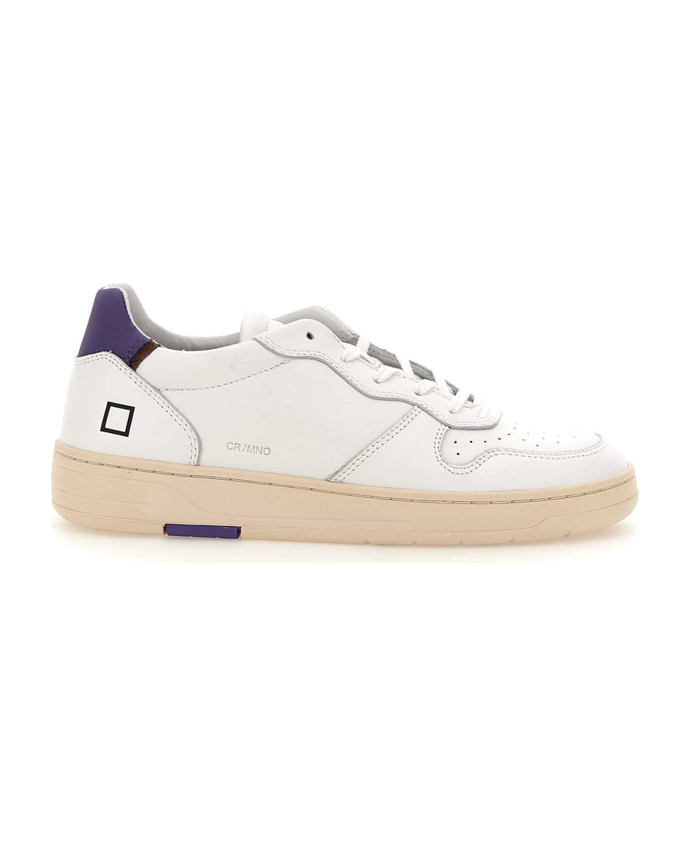 D. A. T. E "Court Mono" women's leather sneakers, white, flat laces same color, contrasting purple heel, iconic side square logo, logo embossed on side and on the tongue, leather and cotton terry lining, internal fussbett raised by 2, 5 cm, two-tone rubber sole 3cm high, holes for perspiration.