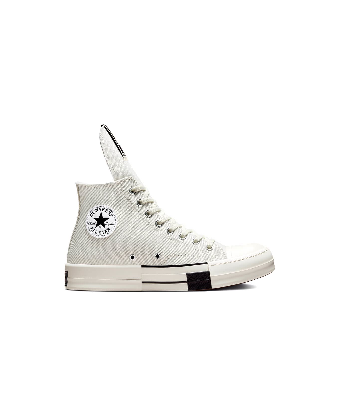 Rick Owens DRKSHDW x Converse Drkstar HI Sneakers These sneakers are from Rick Owens DRKSHDW new collection made in collaboration with Converse. The Chuck 70 high sneakers, here in white, are made of cotton and feature a rubber toe and sole, DRKSHDW and Converse logo patch and black spare shoelaces.