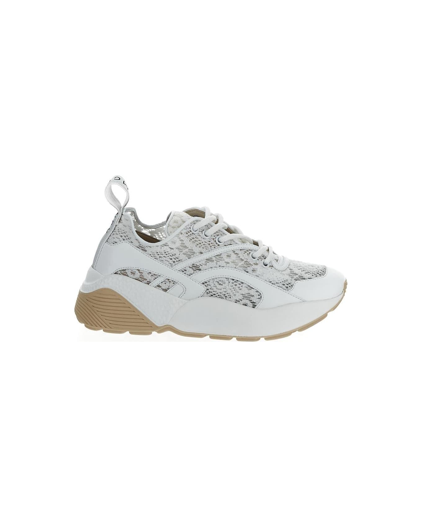 Stella McCartney lace-up sneakers in lily white polyurethane with all-over lace inserts, round toe, light nude elevated pumped-up midsole with embossed details, branded pull tab at the heel and logo on the back.