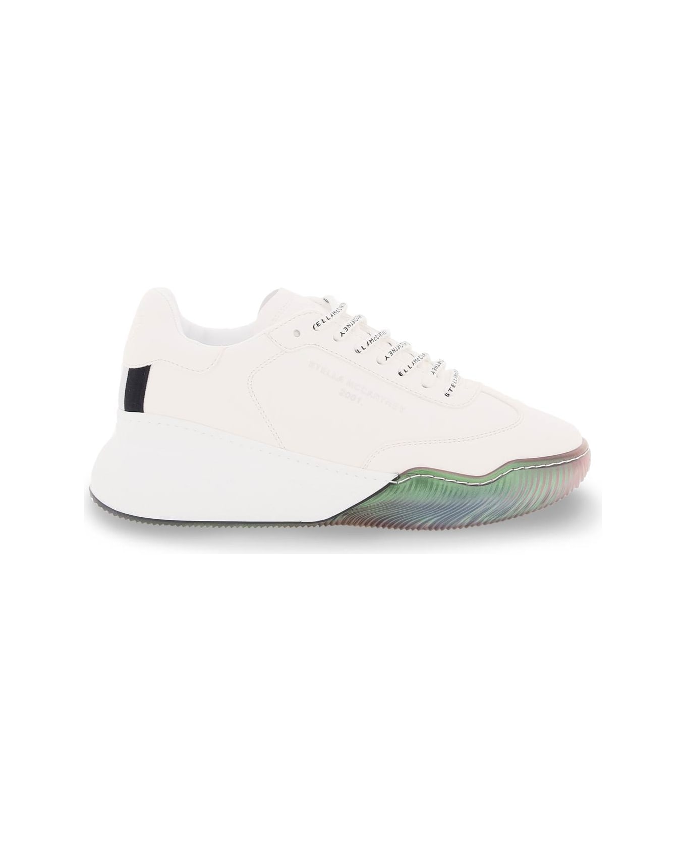 Stella McCartney trainer sneakers in smooth faux leather, characterized by diamanté crystal detail and logo print on the heel tab. Rear two-tone tape, lace-up closure. Stella McCartney 2001 logo debossed on the tongue and printed on the external side. Contrasting painted metal ventilation eyelets on the internal side. Lining in terry-effect bamboo fabric and Econyl Lycra, removable insole and iridescent rubber sole with embossed logo. Branded dust bag and spare laces included.