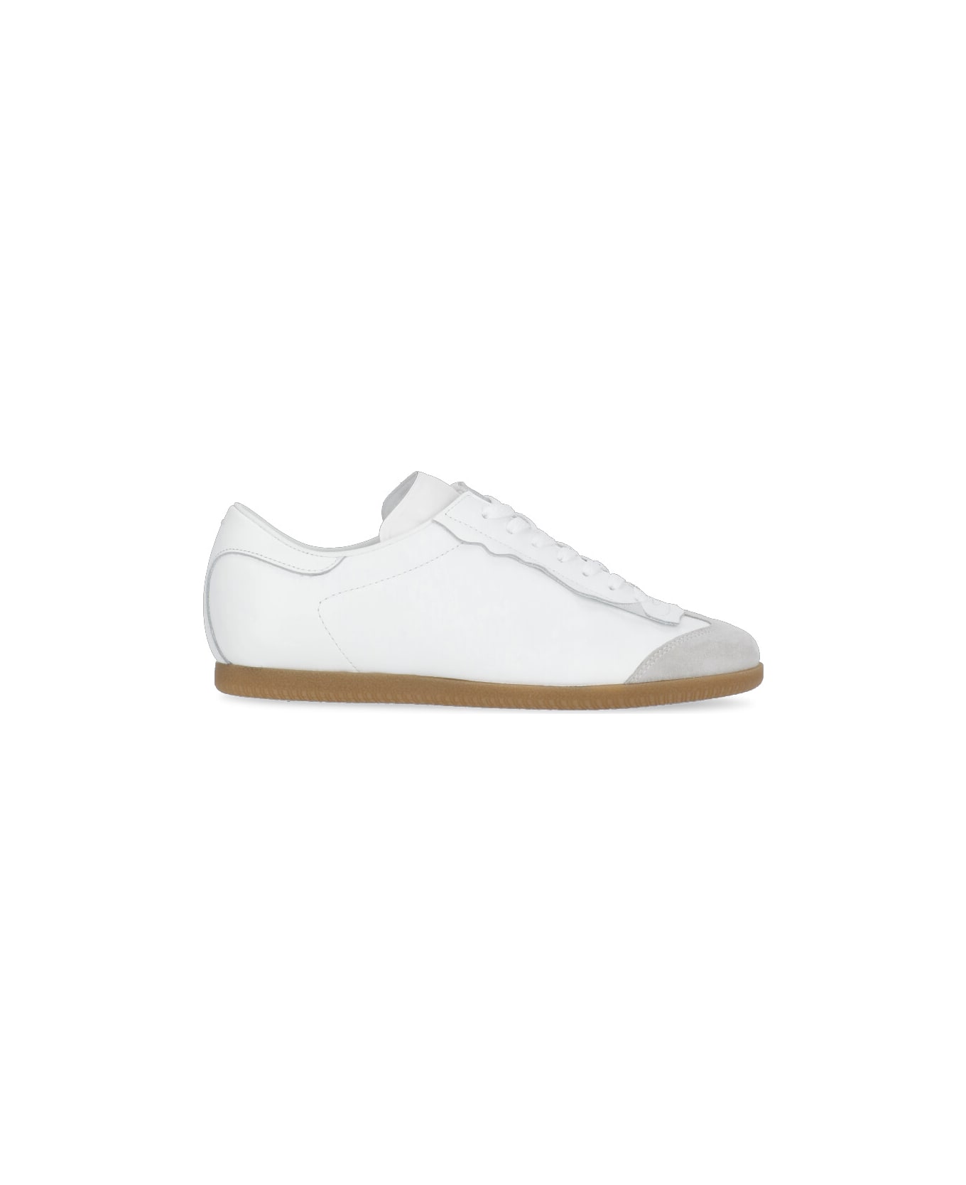 Featherlight Sneakers from Maison Margiela: - White Maison Margiela leather sneakers for woman - Round toe - Logoed tongue - Suede leather inserts - Laser Décortiqué details - Upper heel with iconic visible stitches - Laces fastening