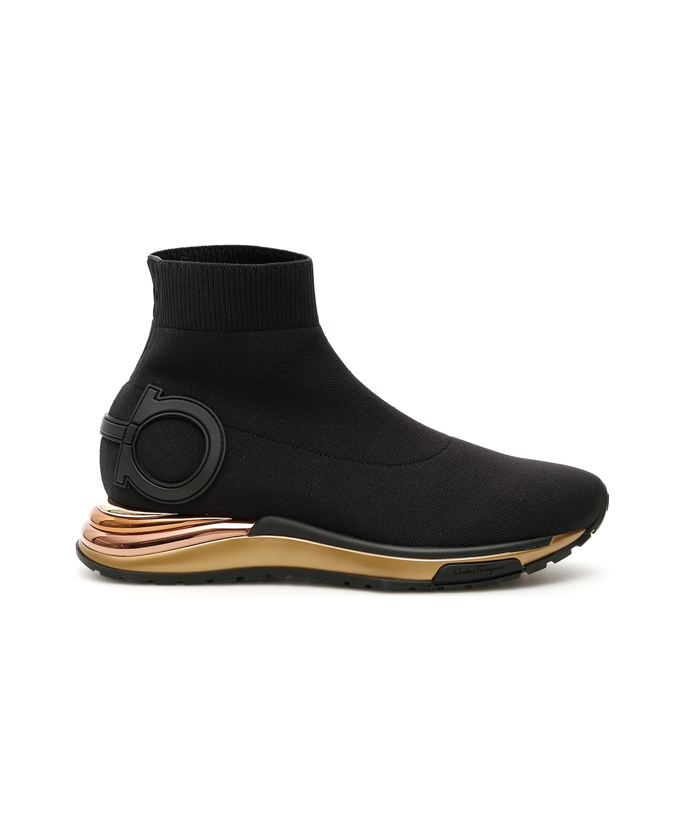 Salvatore Ferragamo Gardena stretch knit sock sneakers enriched by a gold-tone rubber sole with shiny details on the heel. Micro-ribbed hem, leather Gancini on the back, partial leather lining, removable insole, bicolor rubber base with embossed logo and Gancio on the front.