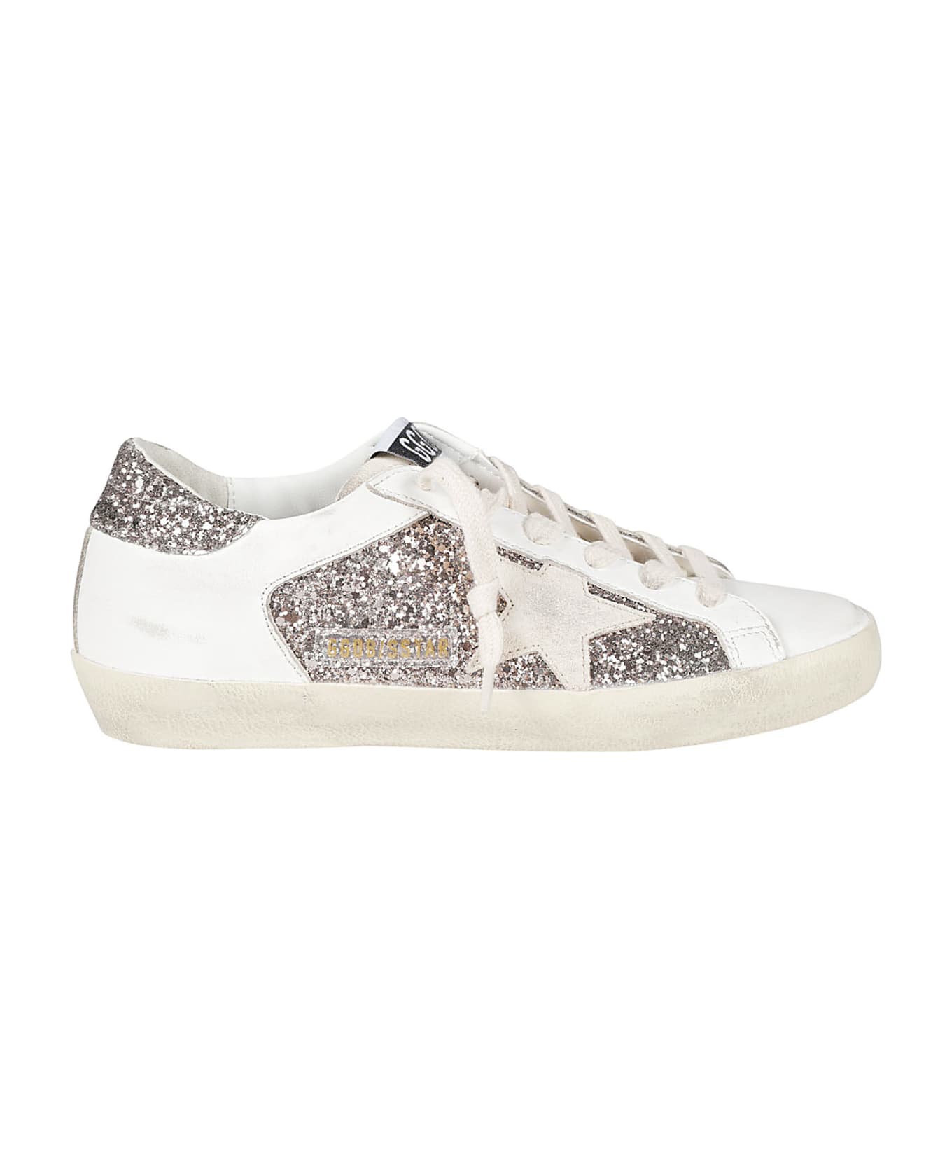 white/silver-tone calf leather panelled design distressed effect glitter detailing signature star patch to the sides appliqué logo round toe front lace-up fastening contrasting heel counter branded insole flat rubber sole