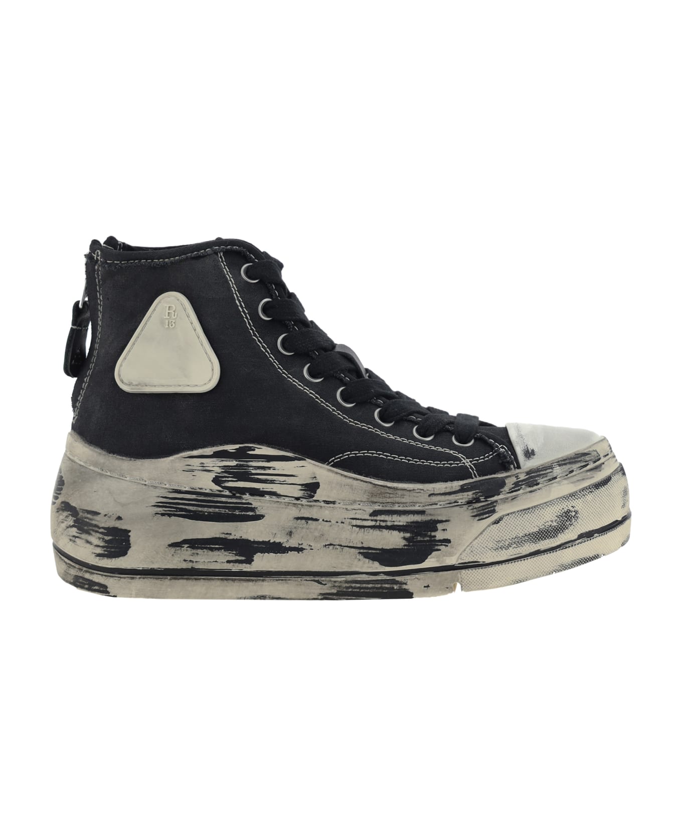 R13's high top sneakers combine a bold design with a distinctive streetwear touch. the high-leg model with platform adds an element of height and style, while the round toe offers comfort and practicality. the brand logo, embossed on an outer side panel, underscores r13's identity. the lace-up front and zippered heel closure ensure a secure fit. the worn-effect sole gives a worn-in, grunge look, perfect for those looking for sneakers with a unique, contemporary style.