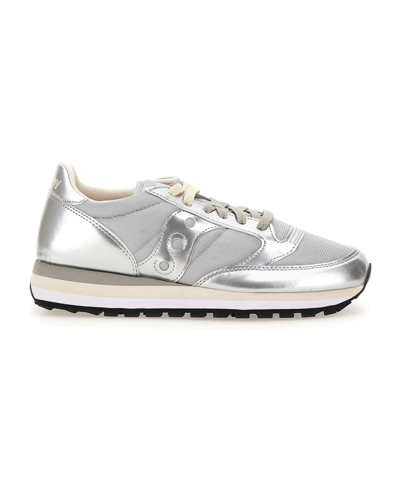 Saucony "Jazz Triple" women's sneakers, mix of materials fabric and suede, silver colour, matching laces, logo on tongue, silver smooth leather heel tab with white logo, 3 cm high multicolor notched rubber sole.