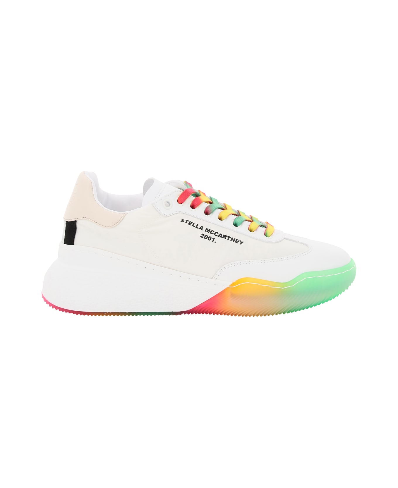 Loop lace-up sneakers by Stella McCartney made of recycled polyester with faux leather front insert and spoiler with engraved logo. Striped fabric insert on heel, logo printed on the side, faux suede tongue with logo and multicolor laces. Faux leather and fabric lining, removable insole, multicolor rubber sole. Extra solid colour laces included.