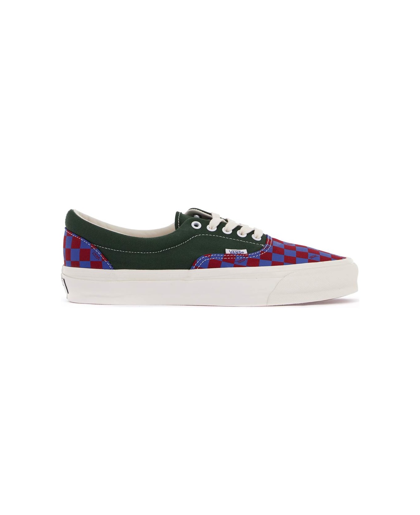 The Vans LX Era Reissue 95 sneakers are made of color block cotton canvas with a checkerboard toe and heel. They feature a front lace-up closure, painted eyelets, an applied logo label on the outer side, and an unlined interior with a removable insole. The rubber sole provides excellent traction.