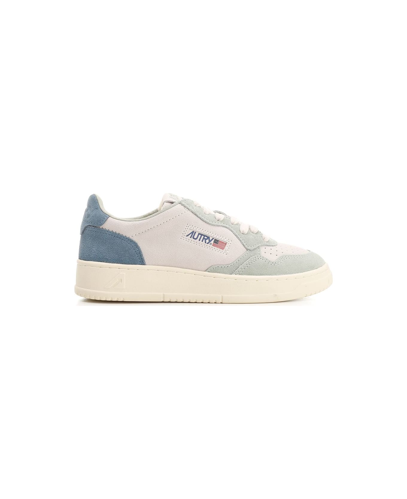 "Medalist" low top sneakers from Autry made of ivory suede, with turquoise blue and aqua blue inserts. Perforated toe, flat laces, rubber sole.