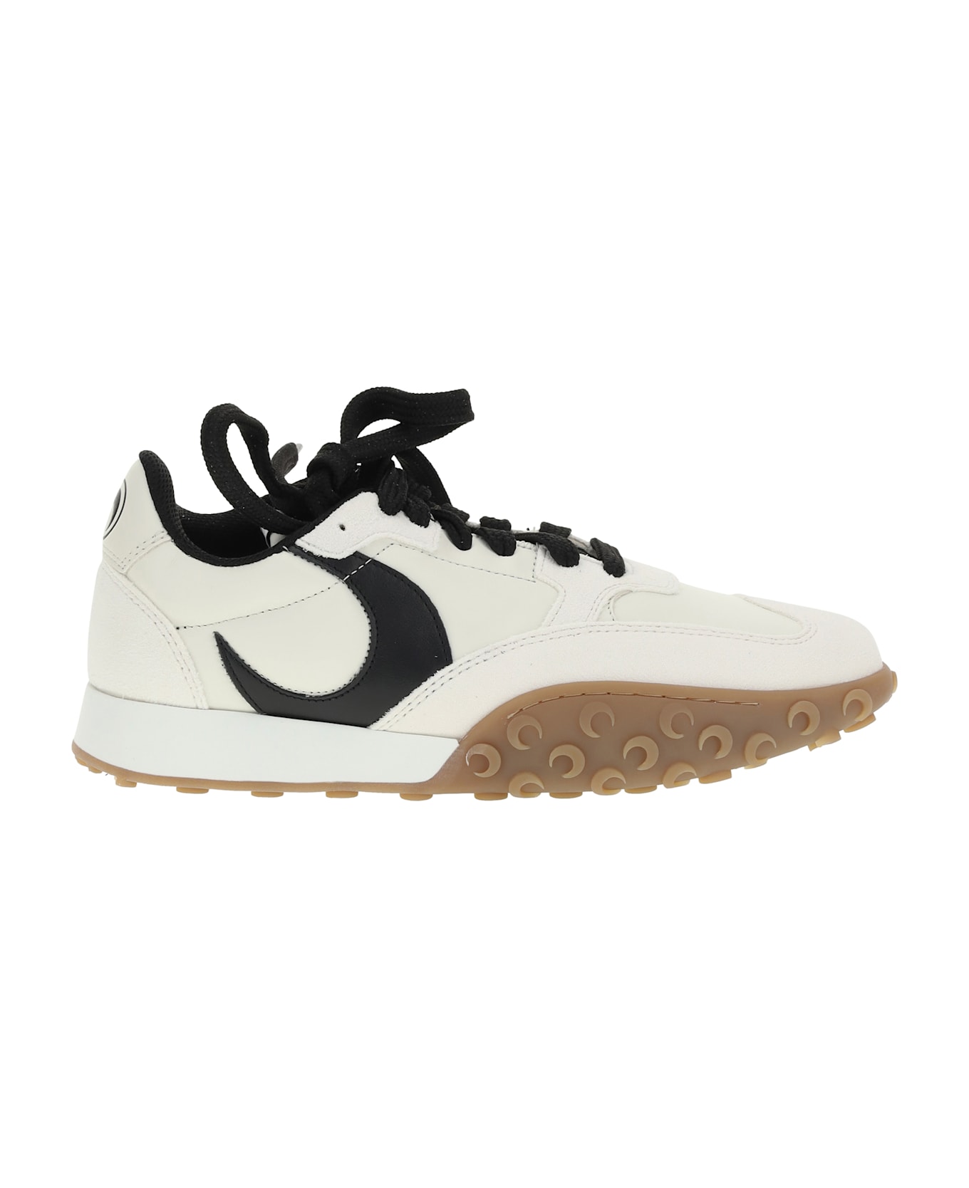 The ms rise leather sneakers by marine serre feature a modern square-toe design and a front lace-up closure that provides a customizable fit. the logo-embossed insole and non-slip knurled platform sole offer comfort and stability. the brand's iconic contrasting monogram on the side panel and suede details add a distinctive and refined touch, making these sneakers a unique and trendy accessory.