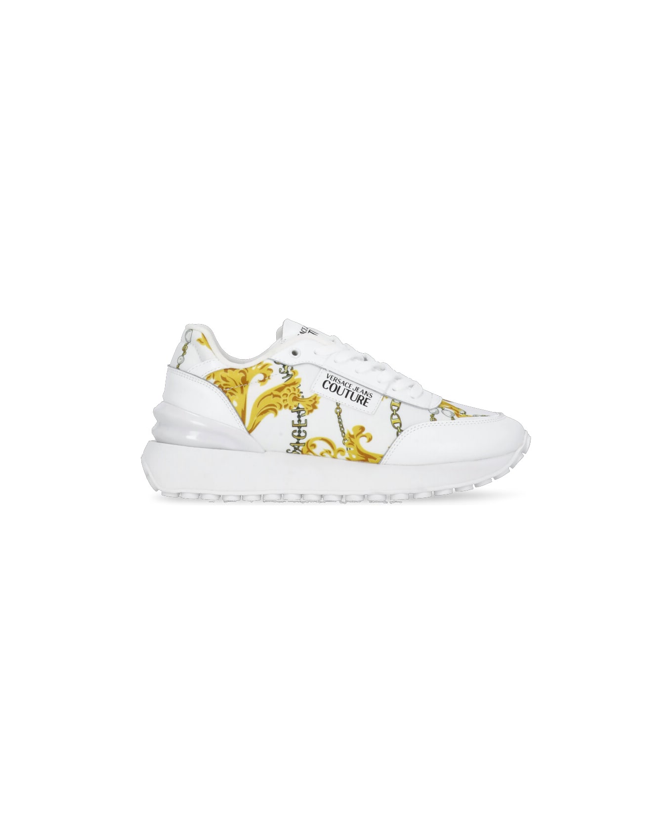 - White Versace Jeans Couture leather sneakers for woman - Round toe - Front laces fastening - Tongue with contrasting colour logo - All-over Baroque print - Raised rubber sole (4 cm)